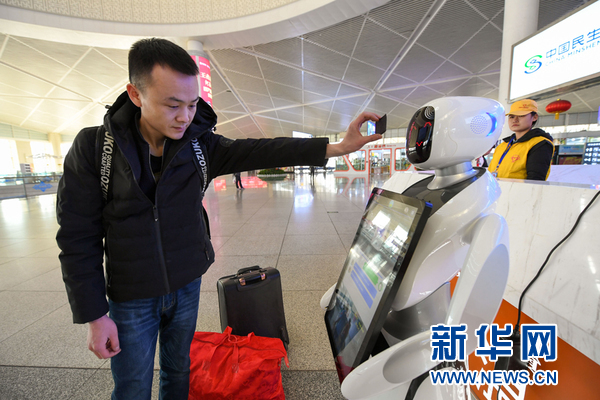 1月22日,在呼和浩特火車(chē)東站,旅客將車(chē)票放在智能機(jī)器人面前掃碼獲取乘車(chē)信息。新華社記者 彭源攝
