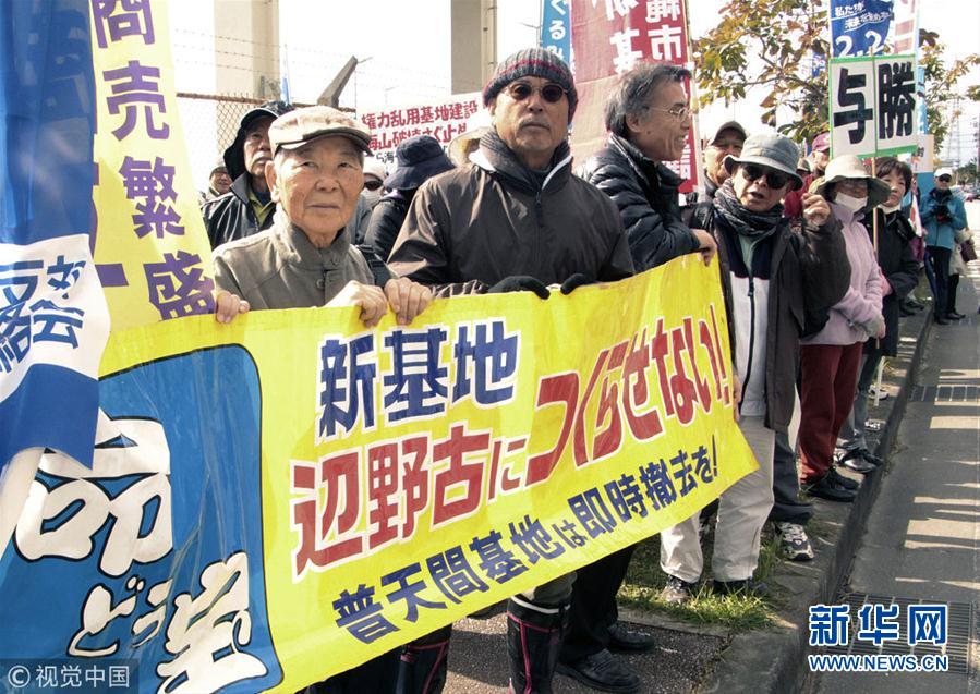 當?shù)貢r間2019年1月26日,日本沖繩縣名護,民眾在美國海軍陸戰(zhàn)隊施瓦布軍營門前舉行集會,呼吁在2月24日的地方公投中投票反對美國海軍陸戰(zhàn)隊普天間空軍基地的搬遷計劃。(圖片來源:視覺中國)