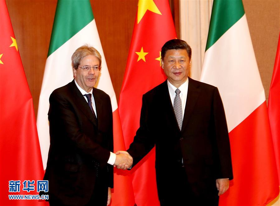 2017年5月16日,習(xí)近平在北京釣魚臺國賓館會見來華出席“一帶一路”國際合作高峰論壇的時任意大利總理真蒂洛尼。(新華社記者劉衛(wèi)兵攝)