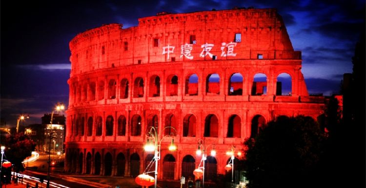 彩燈照耀下,古羅馬斗獸場上“中意友誼”四個漢字格外耀眼。