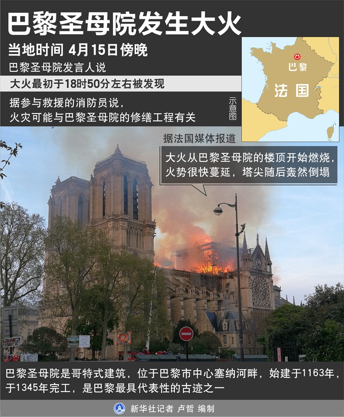 熊熊烈火之中,巴黎圣母院塔尖轟然倒塌。當(dāng)?shù)貢r(shí)間15日傍晚18時(shí)許,位于巴黎市中心、有著800多年歷史的巴黎圣母院發(fā)生大火,整座建筑損毀嚴(yán)重。