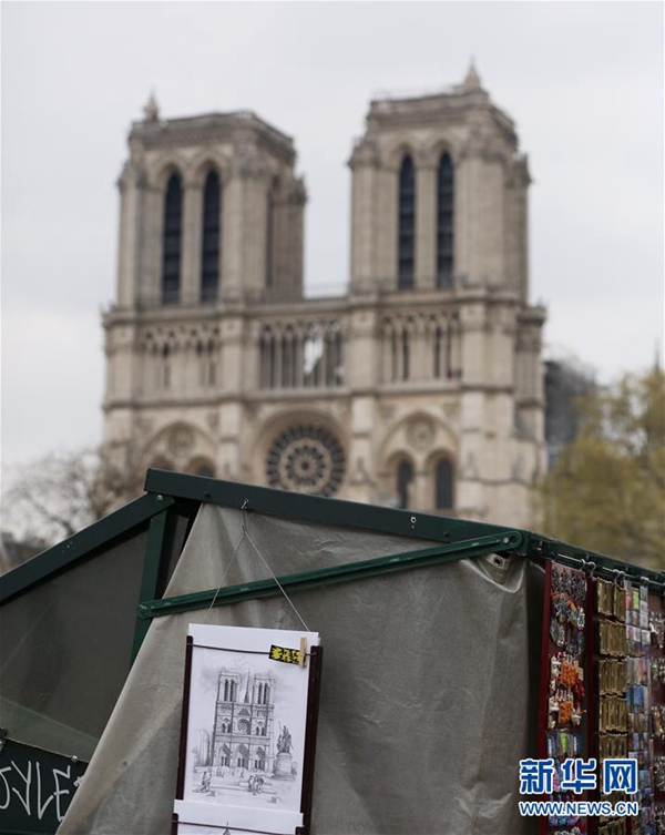 這是4月16日在法國巴黎拍攝的火災后的巴黎圣母院以及書攤上售賣的圣母院圖片。法國總統(tǒng)馬克龍16日晚針對巴黎圣母院嚴重火災發(fā)表簡短電視講話,表示希望在五年內(nèi)重建巴黎圣母院。新華社記者 高靜 攝