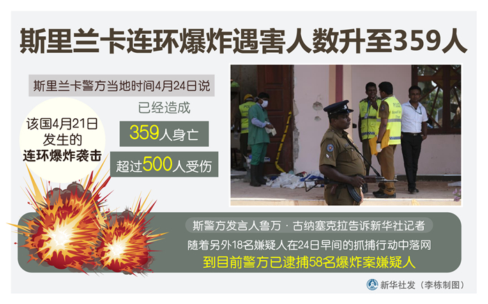 新華社科倫坡4月24日電(記者朱瑞卿 唐璐)斯里蘭卡警方24日說(shuō),該國(guó)21日發(fā)生的連環(huán)爆炸襲擊已經(jīng)造成359人身亡、超過(guò)500人受傷。
