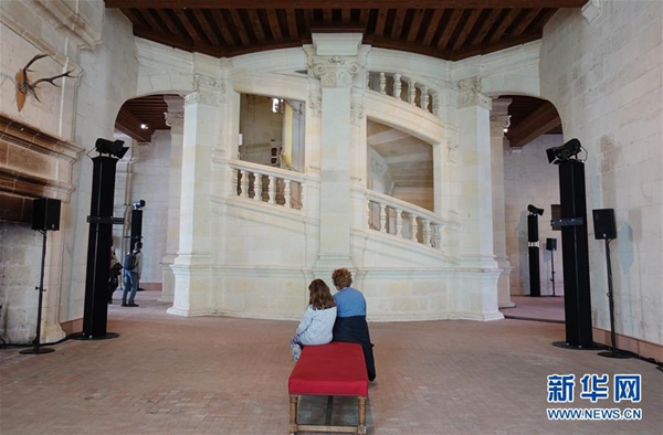 5月1日,游客在法國盧瓦爾河谷地區(qū)的香波堡參觀據(jù)稱來自達(dá)·芬奇構(gòu)思的雙螺旋樓梯。 新華社記者 高靜 攝