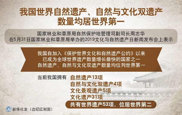 周志華介紹說,33年來,我國的世界遺產(chǎn)事業(yè)從無到有、從小到大,在世界遺產(chǎn)申報、保護、利用和管理等方面取得舉世公認(rèn)的成就。目前我國共有世界遺產(chǎn)53項,位居世界第二。除了自然遺產(chǎn)、自然與文化雙遺產(chǎn)以外,還有文化景觀遺產(chǎn)5項、文化遺產(chǎn)31項。