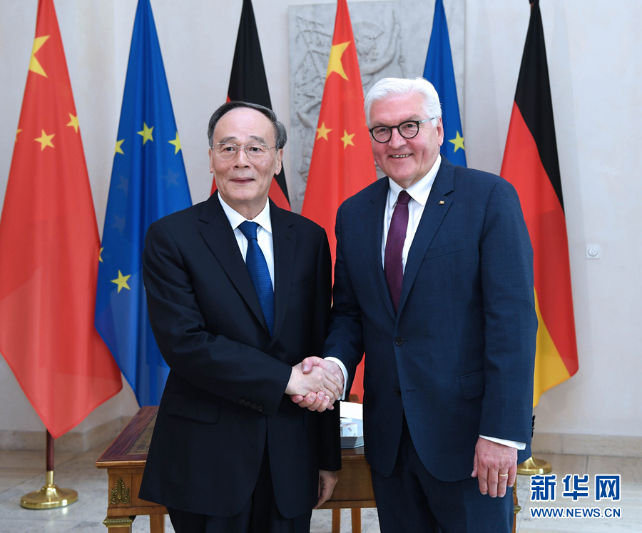 會見施泰因邁爾時,王岐山表示,中德作為世界主要經(jīng)濟體和具有重要影響的大國,兩國關系超越雙邊范疇,具有全球性意義。近年來,兩國高層交往密切,各領域合作不斷深化。我愿通過此訪進一步推動中德全方位戰(zhàn)略伙伴關系取得新發(fā)展。當前兩國關系面臨新形勢,雙方應通過深化合作為世界樹立合作共贏的典范,通過引領中歐合作為世界注入更多穩(wěn)定因素,通過推進全球治理增強維護多邊主義的力量。