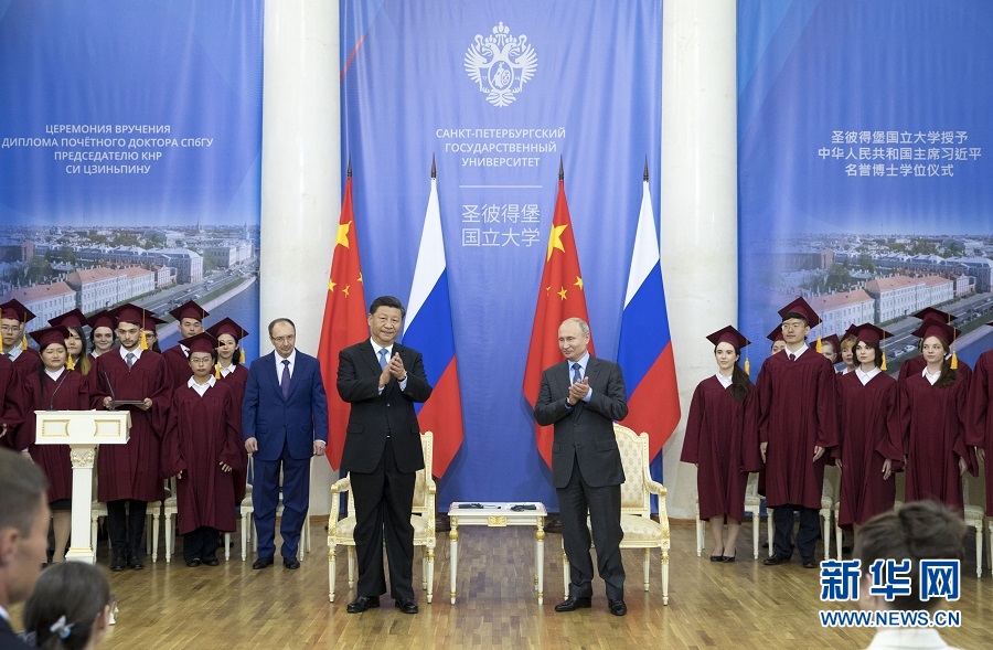 6月6日,國家主席習(xí)近平在圣彼得堡出席接受圣彼得堡國立大學(xué)名譽博士學(xué)位儀式。俄羅斯總統(tǒng)普京出席儀式。新華社記者 王曄 攝