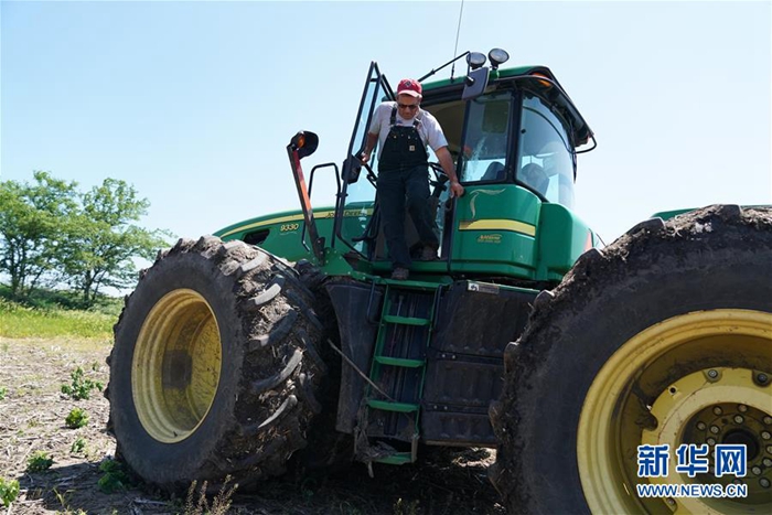 6月9日,在位于美國(guó)中部密蘇里州的小鎮(zhèn)奧里克,湯姆·沃特斯從一輛拖拉機(jī)上下來(lái)。新華社記者 劉杰 攝