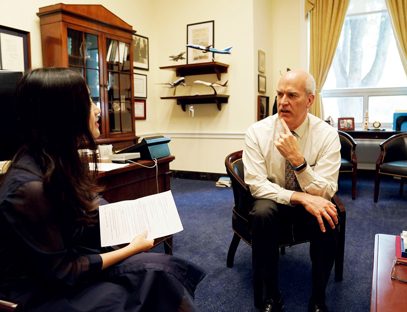越來越多美國有識之士認識到,美國政府加征關稅會損害美國民眾利益。圖為2019年5月9日,美國國會眾議院美中工作小組共同主席、華盛頓州民主黨聯(lián)邦眾議員里克·拉森(右)在華盛頓接受采訪時表示,美國政府對華產(chǎn)品加征關稅的做法損害美國工人與消費者利益,不利于美國經(jīng)濟,也無助于解決兩國經(jīng)貿(mào)問題。 新華社記者 劉杰/攝
