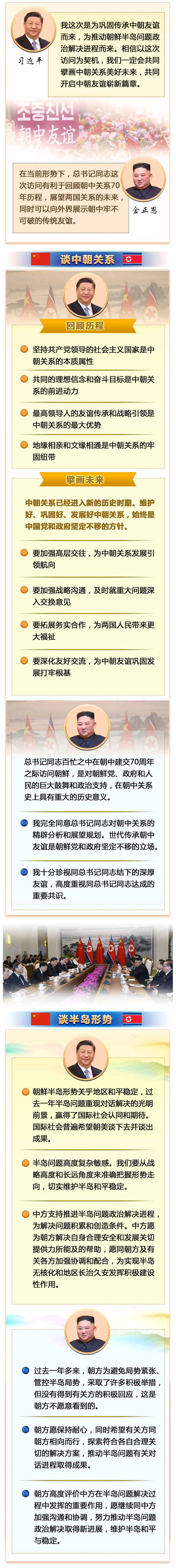 習(xí)近平指出,去年以來,我和委員長同志4次會晤,書寫了中朝關(guān)系新篇章,并結(jié)下了深厚友誼。感謝金正恩委員長同志為我這次訪問舉行的隆重而熱烈的歡迎儀式,我今天從下飛機(jī)到抵達(dá)住處,所到之處無不感受到中朝一家親的濃厚氛圍。今年是中朝建交70周年,在兩黨兩國關(guān)系發(fā)展史上具有承前啟后、繼往開來的重要意義,我又同金正恩委員長在平壤會面。我這次是為鞏固傳承中朝友誼而來,為推動朝鮮半島問題政治解決進(jìn)程而來。相信以這次訪問為契機(jī),我們一定會共同擘畫中朝關(guān)系美好未來,共同開啟中朝友誼嶄新篇章。
