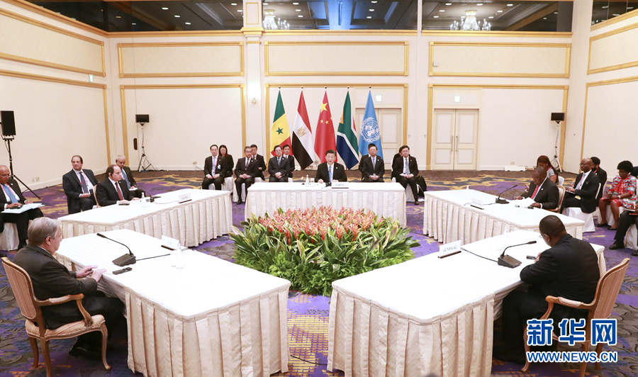6月28日,國(guó)家主席習(xí)近平在大阪主持中非領(lǐng)導(dǎo)人會(huì)晤。中非合作論壇前任非方共同主席國(guó)南非總統(tǒng)拉馬福薩、非洲聯(lián)盟輪值主席國(guó)埃及總統(tǒng)塞西、中非合作論壇現(xiàn)任非方共同主席國(guó)塞內(nèi)加爾總統(tǒng)薩勒和聯(lián)合國(guó)秘書長(zhǎng)古特雷斯出席。新華社記者 龐興雷 攝