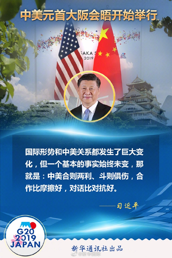 習(xí)近平在會晤開始時說,很高興同總統(tǒng)先生在大阪見面。48年前,也就是1971年,就在離這里100多公里的名古屋,參加第三十一屆世界乒乓球錦標(biāo)賽的中美乒乓球運動員進行了友好互動,這就是后來人們說的“乒乓外交”的開啟,創(chuàng)造了“小球轉(zhuǎn)動大球”的歷史佳話。8年之后的1979年,中美建立了外交關(guān)系?;仡櫧ń灰詠淼?0年,國際形勢和中美關(guān)系都發(fā)生了巨大變化,但一個基本的事實始終未變,那就是:中美合則兩利、斗則俱傷,合作比摩擦好,對話比對抗好。近來,我同總統(tǒng)先生通過電話和書信保持著密切聯(lián)系。今天,我愿同總統(tǒng)先生就事關(guān)中美關(guān)系發(fā)展的根本性問題交換意見,為下階段兩國關(guān)系發(fā)展定向把舵,推進以協(xié)調(diào)、合作、穩(wěn)定為基調(diào)的中美關(guān)系。