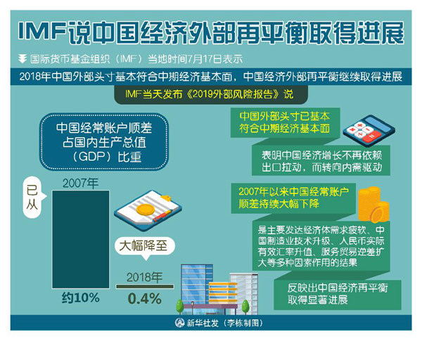 新華社華盛頓7月17日電(記者高攀 熊茂伶)國際貨幣基金組織(IMF)17日表示,2018年中國外部頭寸基本符合中期經濟基本面,中國經濟外部再平衡繼續(xù)取得進展。