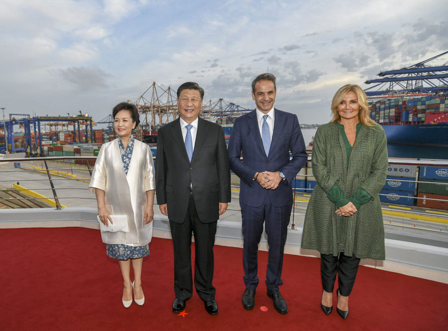 這是習(xí)近平和夫人彭麗媛同米佐塔基斯夫婦在港口樓頂平臺(tái)合影。新華社記者謝環(huán)馳攝