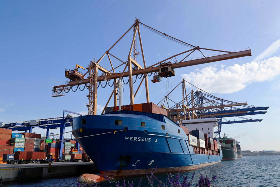 9月6日,在希臘比雷埃夫斯港,裝有進(jìn)博會(huì)參展貨物的冷箱正在裝船。新華社記者李曉鵬攝