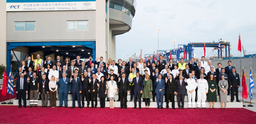 這是習(xí)近平夫婦和米佐塔基斯夫婦同中遠(yuǎn)當(dāng)?shù)貑T工等合影。新華社記者黃敬文攝