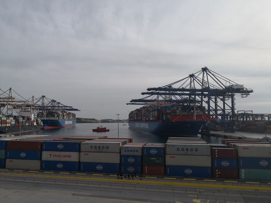 兩艘巨輪,一艘是2萬(wàn)標(biāo)準(zhǔn)箱級(jí)集裝箱船“中遠(yuǎn)海運(yùn)獅子座”,一艘是1.4萬(wàn)標(biāo)準(zhǔn)箱級(jí)集裝箱船“中遠(yuǎn)海運(yùn)比利時(shí)”,它們滿載著來(lái)自中國(guó)、新加坡、越南、馬來(lái)西亞的貨物,從太平洋經(jīng)由蘇伊士運(yùn)河駛?cè)氲刂泻?,將由比港駛往荷蘭鹿特丹和德國(guó)漢堡。