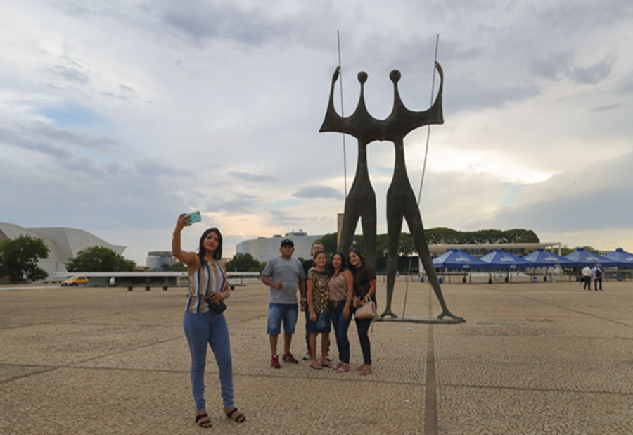 這是2019年11月2日,游人在巴西利亞三權廣場首都開拓者雕像前合影。新華社記者蘭紅光攝