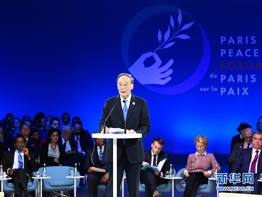11月12日,國家副主席王岐山在法國巴黎出席第二屆巴黎和平論壇開幕式并致辭。 新華社記者 申宏 攝