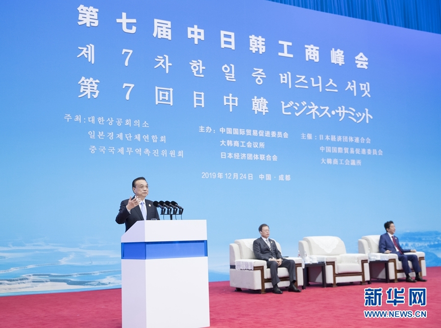 12月24日,國務院總理李克強在四川成都與韓國總統(tǒng)文在寅、日本首相安倍晉三共同出席第七屆中日韓工商峰會并致辭。 新華社記者 王曄 攝