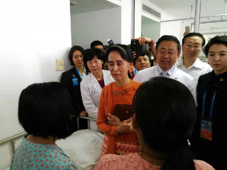 ▲2017年5月16日,緬甸國務(wù)資政昂山素季來到北京安貞醫(yī)院看望受救助在京做手術(shù)的緬甸先心病患兒。她在北京出席首屆“一帶一路”國際合作高峰論壇。新華社記者李雪笛攝