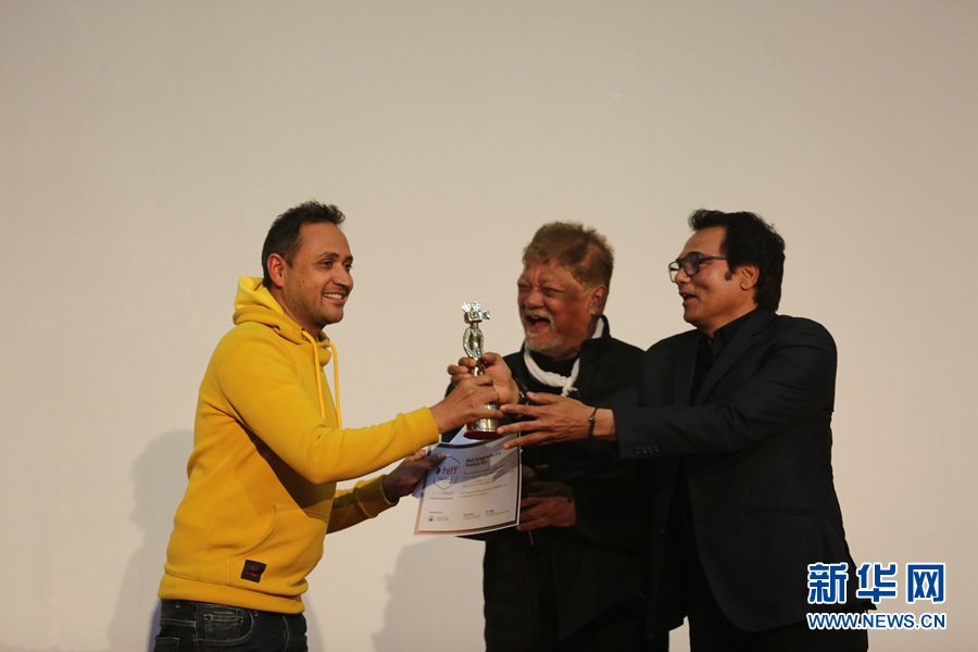2月17日,第三屆尼泊爾國際電影節(jié)的閉幕儀式在加德滿都市政大廳內(nèi)舉行,資深電影人士正在給獲獎(jiǎng)?wù)撸ㄗ螅╊C獎(jiǎng)。本屆電影節(jié)2月13日開始,一共有來自40個(gè)國家和地區(qū)的80部影片入選,其中中國和哈薩克斯坦聯(lián)合拍攝的《音樂家》作為開幕電影,備受關(guān)注。記者 唐薇 攝?