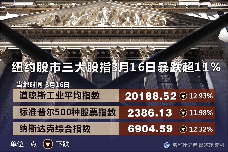 收盤時,紐約股市三大股指均暴跌超過11%,道指創(chuàng)下1987年“黑色星期一”以來的最大單日跌幅,美股自本月9日以來第三次觸發(fā)熔斷機制。