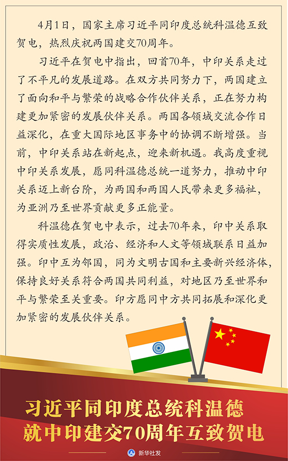 新華社北京4月1日電 4月1日,國家主席習(xí)近平同印度總統(tǒng)科溫德互致賀電,熱烈慶祝兩國建交70周年。