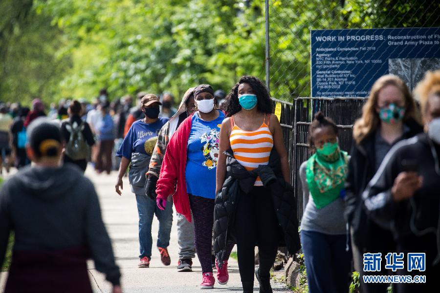 5月3日,在美國紐約,人們在一個發(fā)放點(diǎn)排隊(duì)領(lǐng)取口罩。 新華社發(fā)(郭克攝)