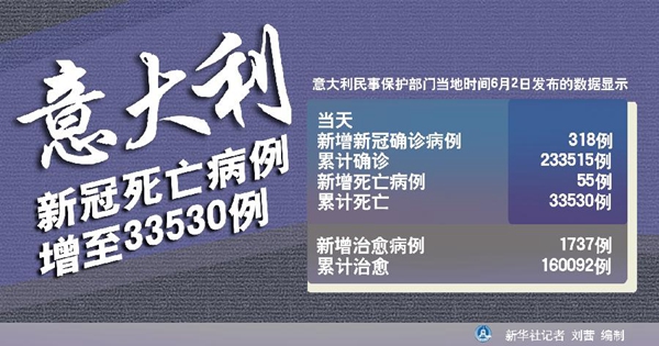 新華社羅馬6月2日電(記者陳占杰)意大利民事保護部門2日發(fā)布的數(shù)據(jù)顯示,該國當(dāng)天新增新冠確診病例318例,累計確診233515例;新增死亡病例55例,累計死亡33530例。