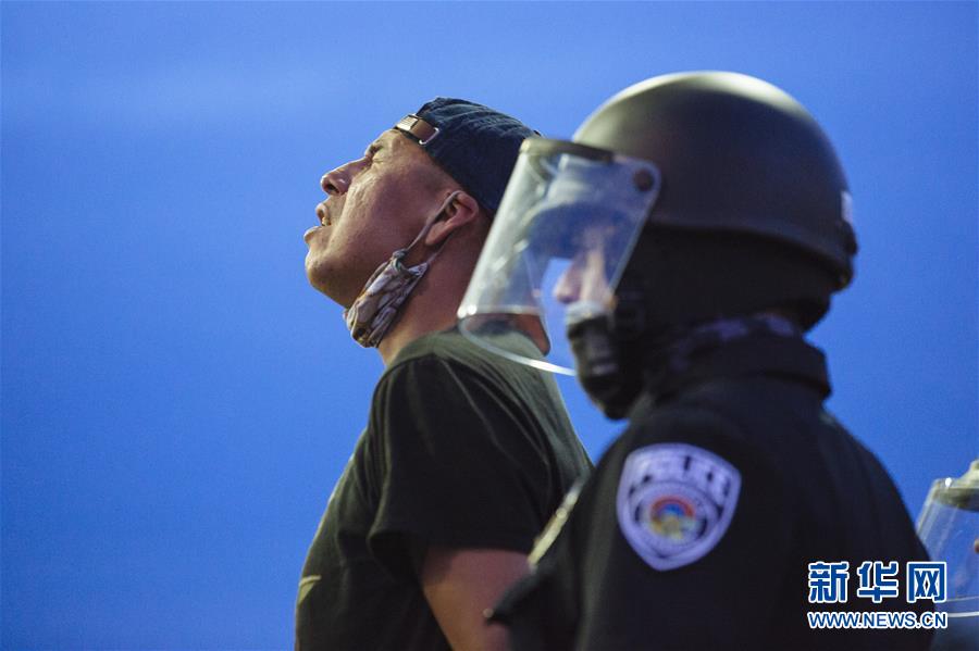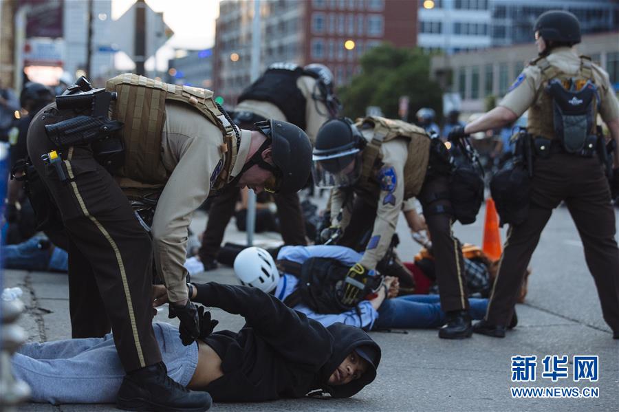 5月31日,在美國(guó)明尼蘇達(dá)州明尼阿波利斯市,示威者被警察逮捕。 新華社發(fā)(安格斯·亞歷山大攝)