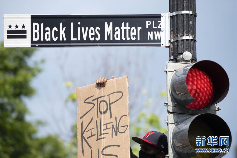 6月6日,一名男子手舉“停止殺害我們”的標(biāo)語(yǔ)在美國(guó)華盛頓白宮附近的“黑人的命也是命廣場(chǎng)”路牌下參加游行活動(dòng)。 新華社記者 劉杰 攝