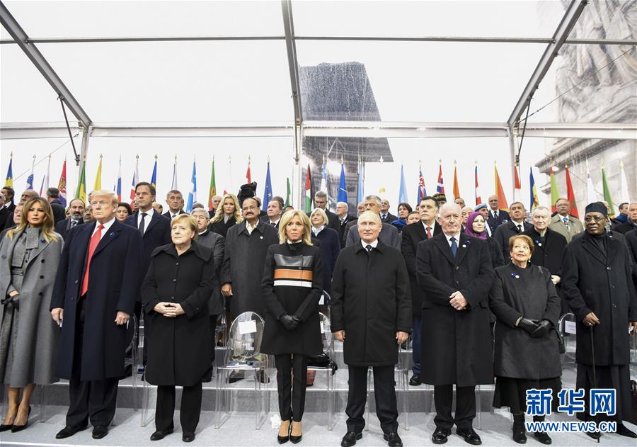 2018年11月11日,在法國(guó)巴黎,俄羅斯總統(tǒng)普京(前右四)、德國(guó)總理默克爾(前左三)與美國(guó)總統(tǒng)特朗普(前左二)出席紀(jì)念儀式。當(dāng)日,法國(guó)政府在巴黎凱旋門前舉行儀式,隆重紀(jì)念第一次世界大戰(zhàn)結(jié)束一百周年。新華社記者 陳益宸 攝