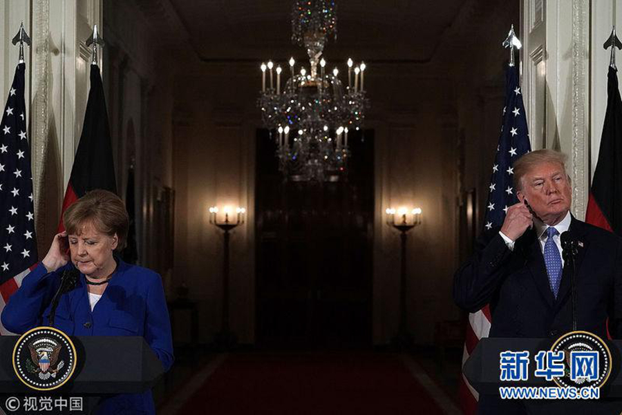 2018年4月27日,美國(guó)華盛頓,美國(guó)總統(tǒng)特朗普會(huì)見德國(guó)總理默克爾。(圖片來(lái)源:視覺中國(guó))