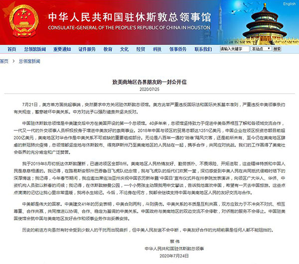 7月21日,美方單方面挑起事端,突然要求中方關(guān)閉駐休斯敦總領(lǐng)館。美方此舉嚴(yán)重違反國際法和國際關(guān)系基本準(zhǔn)則,嚴(yán)重違反中美領(lǐng)事條約有關(guān)規(guī)定,蓄意破壞中美關(guān)系。中方對此予以強(qiáng)烈譴責(zé)并堅(jiān)決反對。