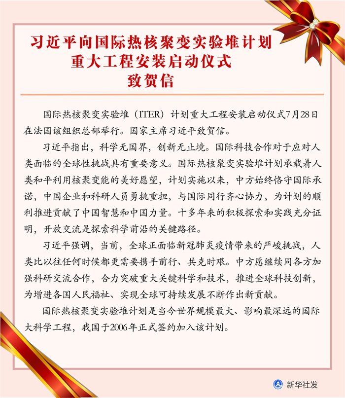 新華社北京7月28日電 國(guó)際熱核聚變實(shí)驗(yàn)堆(ITER)計(jì)劃重大工程安裝啟動(dòng)儀式7月28日在法國(guó)該組織總部舉行。國(guó)家主席習(xí)近平致賀信。