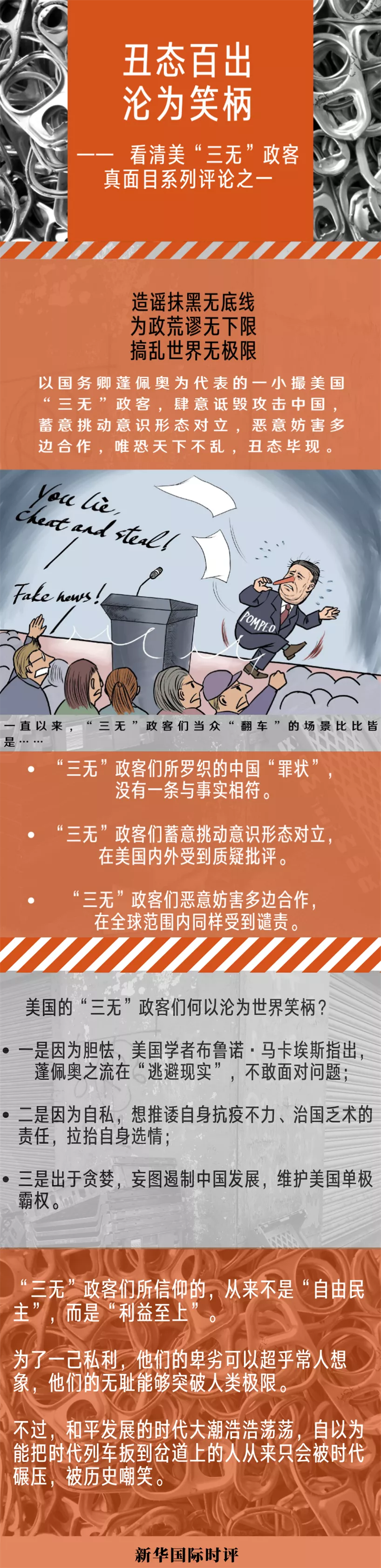 一段時(shí)間以來(lái),以國(guó)務(wù)卿蓬佩奧為代表的一小撮造謠抹黑無(wú)底線、為政荒謬無(wú)下限、搞亂世界無(wú)極限的美國(guó)“三無(wú)”政客,肆意詆毀攻擊中國(guó),蓄意挑動(dòng)意識(shí)形態(tài)對(duì)立,惡意妨害多邊合作,唯恐天下不亂,丑態(tài)畢現(xiàn)。