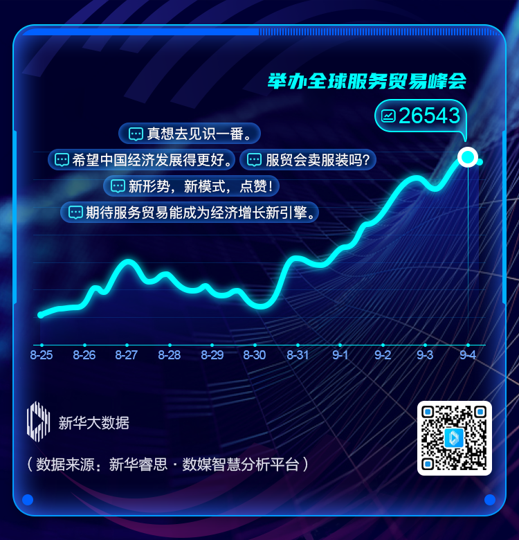 9月4日,2020年中國(guó)國(guó)際服務(wù)貿(mào)易交易會(huì)(簡(jiǎn)稱服貿(mào)會(huì))在北京開幕。作為疫情發(fā)生以來(lái)我國(guó)在線下舉辦的第一場(chǎng)重大國(guó)際經(jīng)貿(mào)活動(dòng),服貿(mào)會(huì)受到輿論廣泛關(guān)注,話題信息量不斷增加,網(wǎng)絡(luò)討論熱度更是高達(dá)96.57,位居話題熱度榜首。不少網(wǎng)民表示“真想去見(jiàn)識(shí)一番”“新形勢(shì)、新模式,點(diǎn)贊!”“期待服務(wù)貿(mào)易能成為經(jīng)濟(jì)增長(zhǎng)新引擎”。但面對(duì)鋪天蓋地的服貿(mào)會(huì)相關(guān)信息,也有部分網(wǎng)民表示“疑惑”,“服貿(mào)會(huì)賣服裝嗎?”“服貿(mào)會(huì)上都展出什么服務(wù)呢?”……
