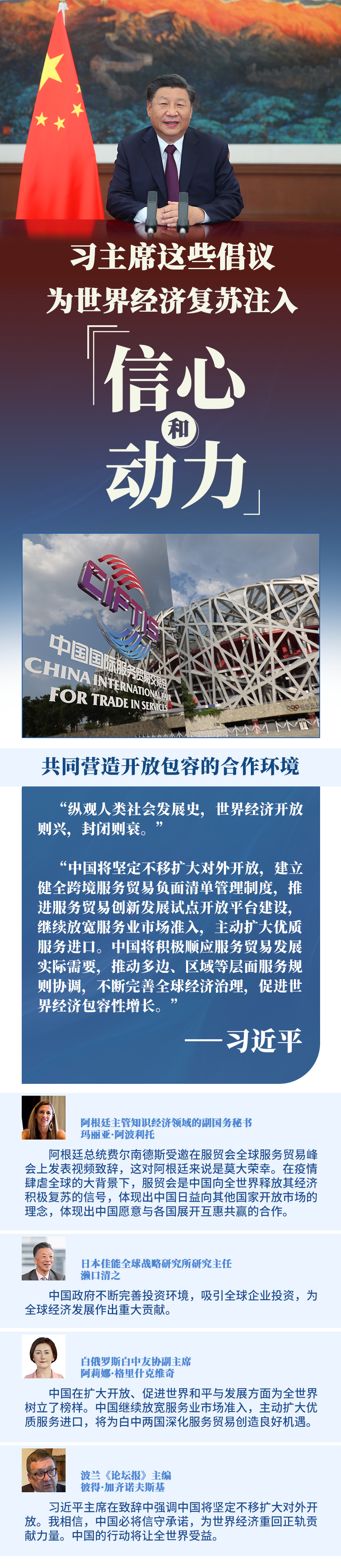 在全球范圍新冠疫情尚未得到全面控制、經(jīng)濟全球化遭遇逆流的背景下,習主席就促進全球服務(wù)業(yè)開放合作提出3點倡議,為推動世界經(jīng)濟盡快復(fù)蘇注入信心和動力,向國際社會展現(xiàn)中國負責任大國的作為和擔當。