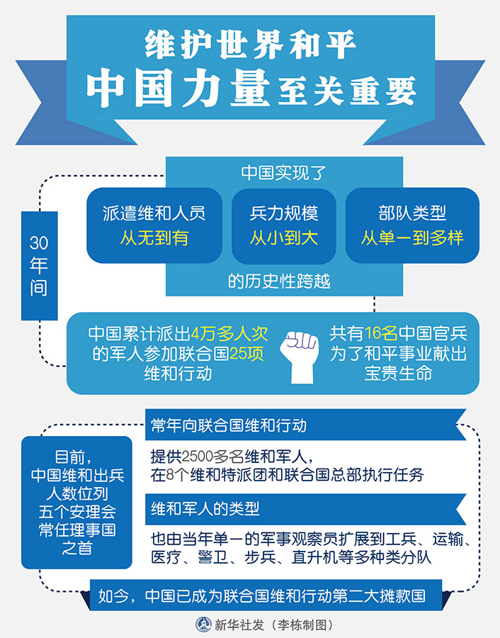 30年間,中國實現(xiàn)了派遣維和人員從無到有、兵力規(guī)模從小到大、部隊類型從單一到多樣的歷史性跨越。30年間,中國累計派出4萬多人次的軍人參加聯(lián)合國25項維和行動,共有16名中國官兵為了和平事業(yè)獻出寶貴生命。他們,都擁有一個共同的名字:“中國藍盔”。