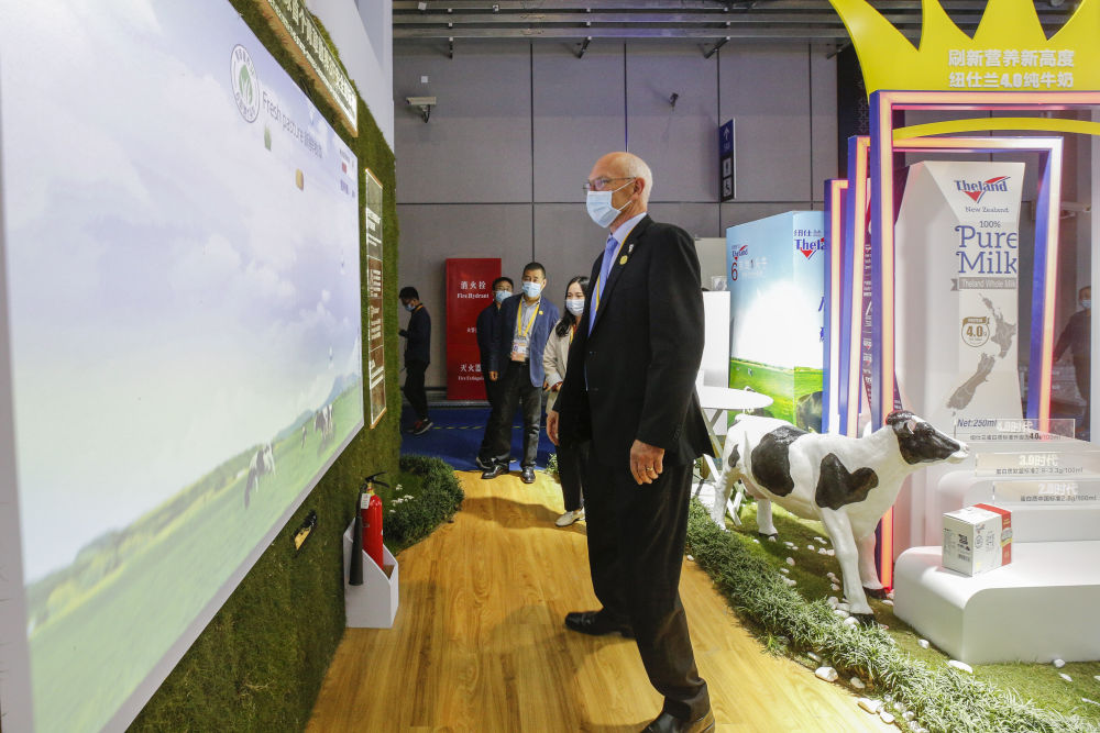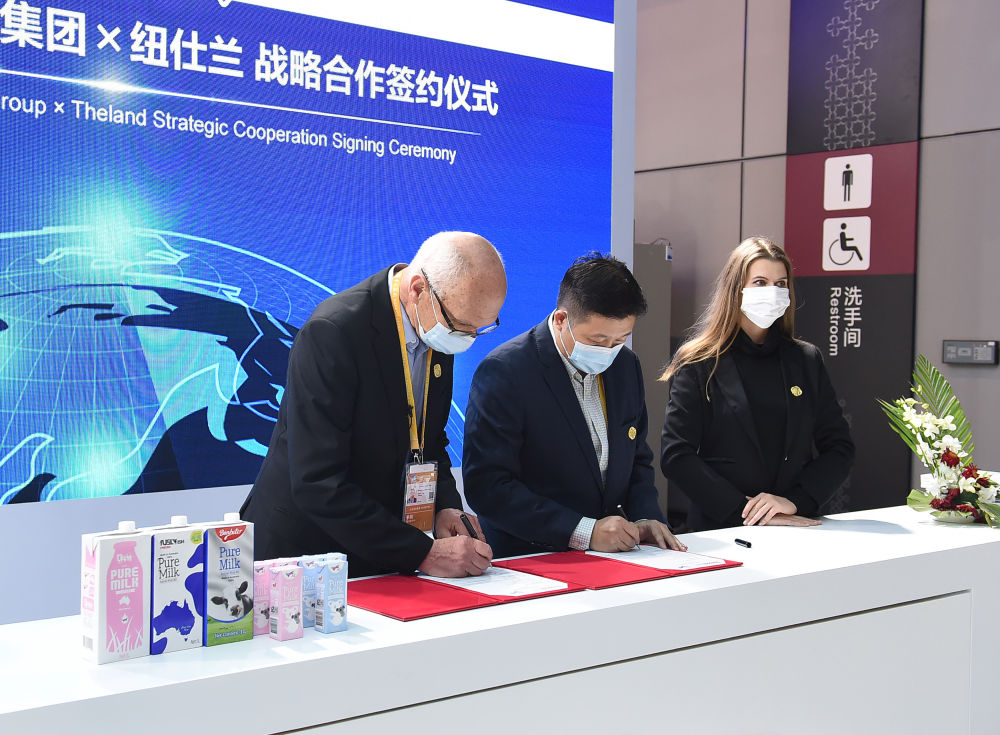11月5日,羅伊(左一)在進(jìn)博會(huì)上的紐仕蘭乳業(yè)展臺(tái)參加簽約儀式。