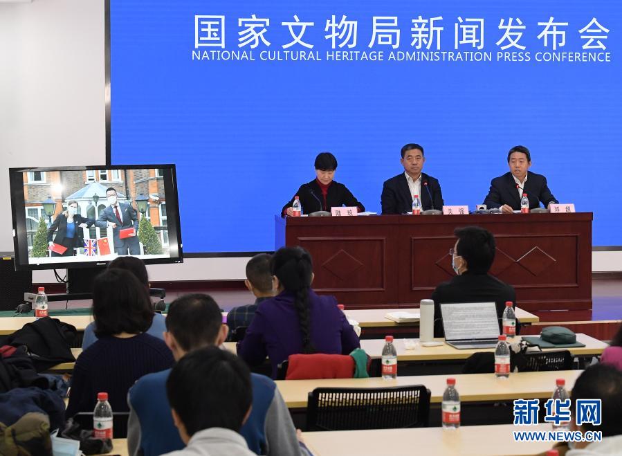11月18日,國(guó)家文物局文物返還辦公室主任鄧超(右一)向媒體介紹文物返還交接情況。新華社記者 李賀 攝