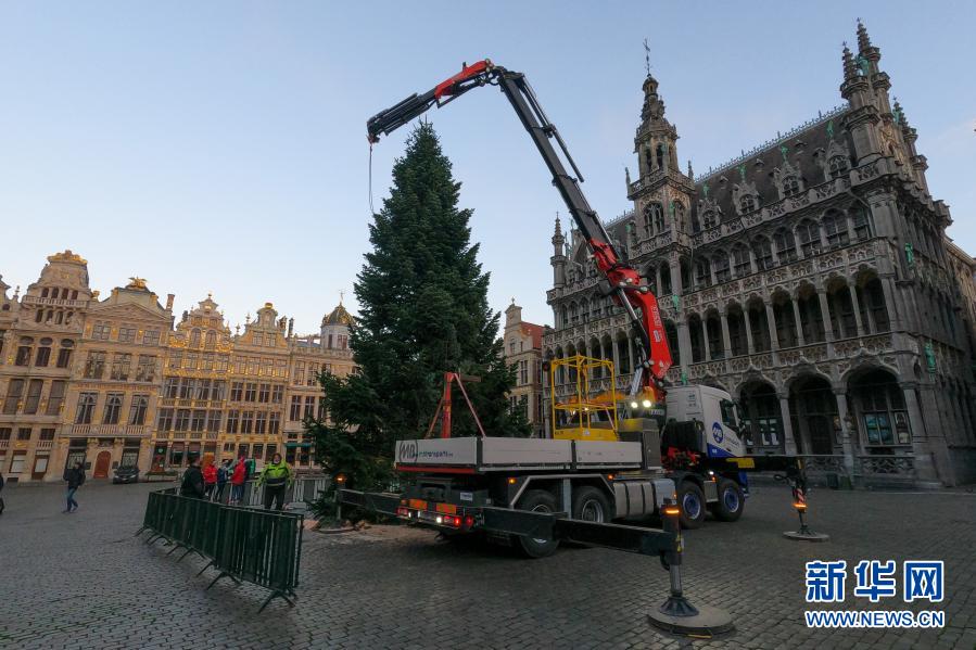 這是11月19日在比利時(shí)布魯塞爾大廣場(chǎng)拍攝的圣誕樹安裝現(xiàn)場(chǎng)。