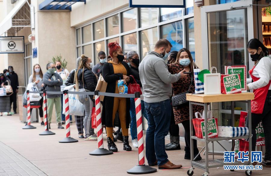 11月27日,人們?cè)诿绹?guó)馬里蘭州國(guó)家港灣一處購物中心排隊(duì)等待進(jìn)店購物。