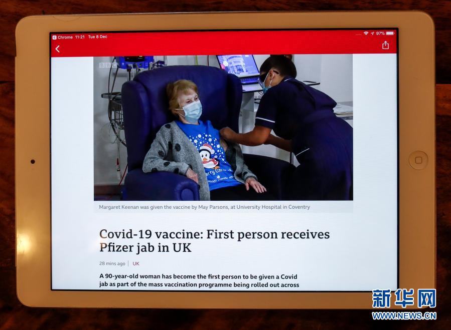 12月8日在英國(guó)倫敦拍攝的播放新聞的電腦屏幕顯示,醫(yī)護(hù)人員為90歲女子瑪格麗特·基南接種疫苗?,敻覃愄亍せ鲜窃搰?guó)首位接種新冠疫苗的人。
