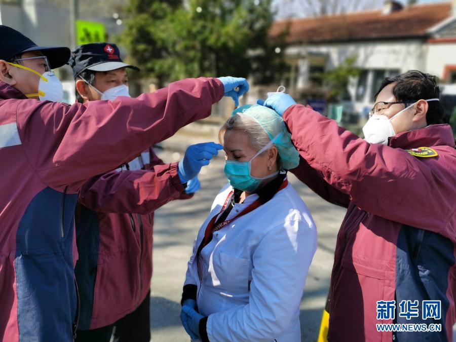 4月4日,中國赴塞爾維亞抗疫醫(yī)療專家組在貝爾格萊德的基層發(fā)熱門診走訪時,幫助塞爾維亞醫(yī)生特里富諾維奇(中)佩戴高標準的防護口罩。新華社發(fā)