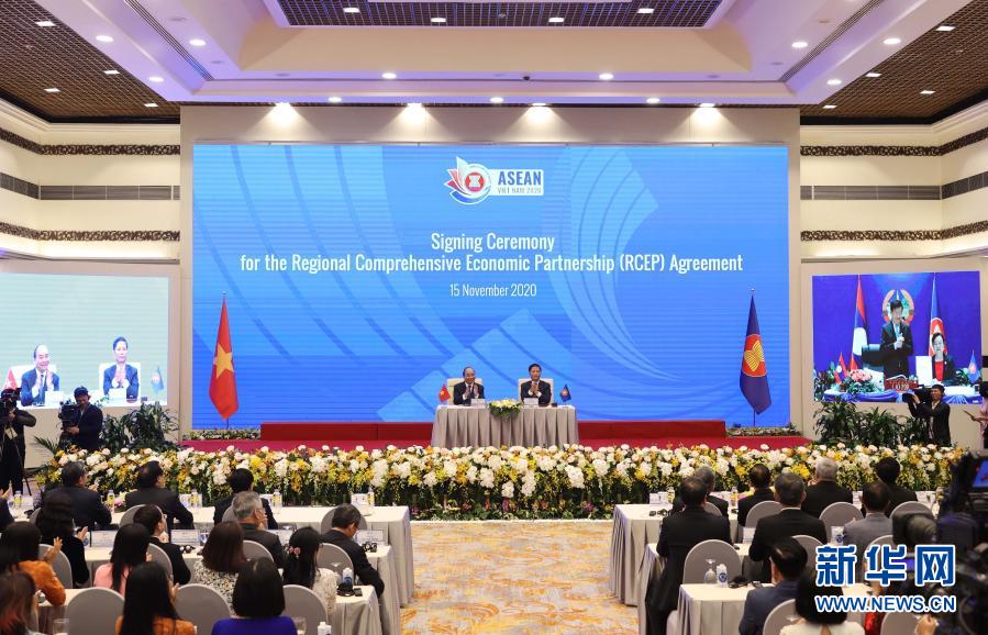 這是11月15日在越南首都河內(nèi)拍攝的區(qū)域全面經(jīng)濟伙伴關(guān)系協(xié)定(RCEP)簽署儀式現(xiàn)場。新華社/越通社