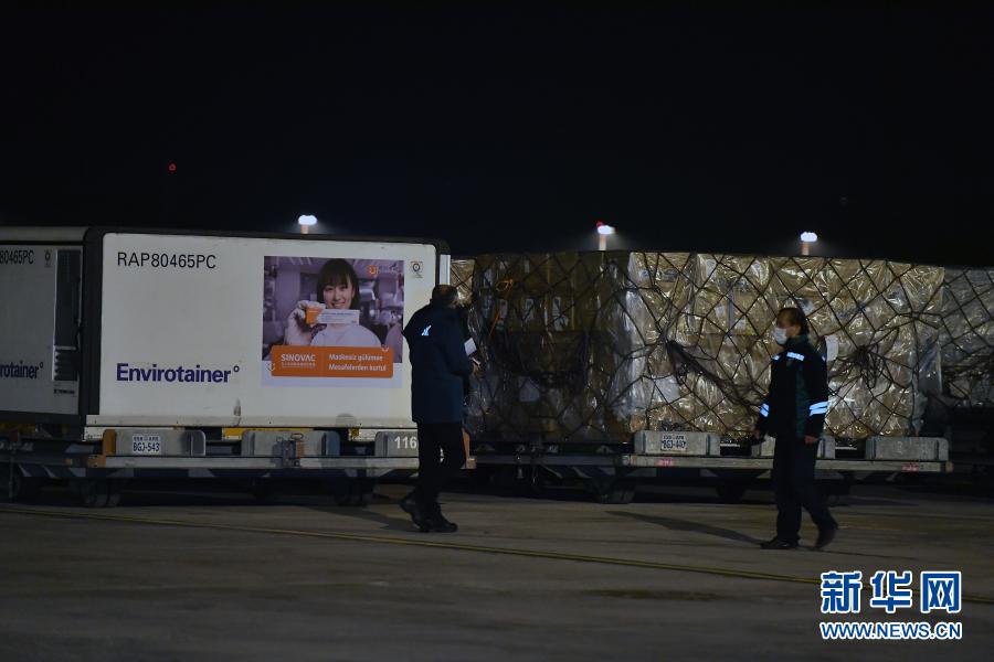 12月30日,在土耳其安卡拉的埃森博阿機場,工作人員從飛機上搬運中國科興公司生產(chǎn)的新冠疫苗。新華社發(fā)(穆斯塔法·卡亞攝)