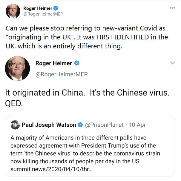 英國出現(xiàn)變異新冠病毒后,世衛(wèi)組織(WHO)將起源地列為英國,不少主流媒體也引用了相關(guān)言論。但這讓英國右翼政黨獨(dú)立黨(UKIP)成員,曾擔(dān)任歐洲議會議員羅杰·赫爾默坐不住了。