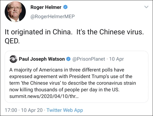 赫爾默28日推文稱不要將病毒變種稱為“起源自英國”,但4月發(fā)布的下圖聲稱病毒“起源自中國,就是中國病毒”。